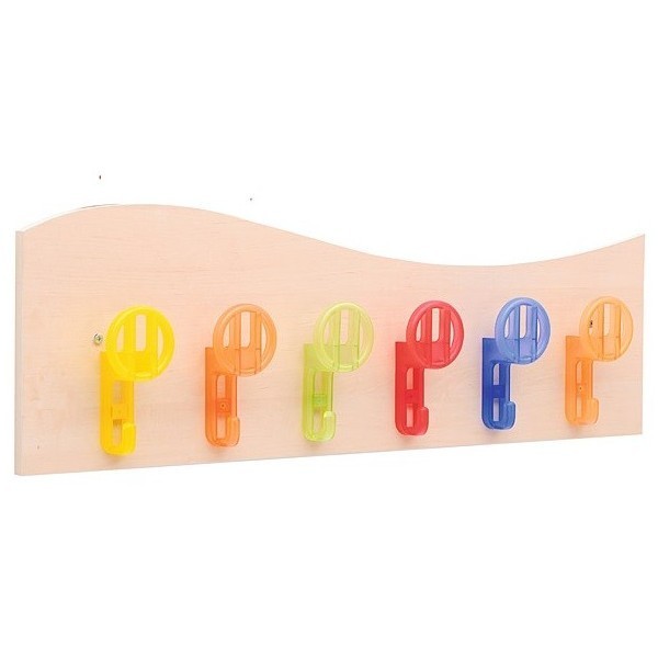 Le porte manteaux est composé de 6 patères colorées fixées à un panneau de coloris bouleau.