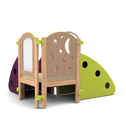 La structure de motricité crèche propose aux bébés de nombreuses activités pour développer leurs capacités motrices et sensorielles : glissade, l'escalade, des panneaux avec découpes de formes, des cachettes, ainsi que la sensation du bois (hêtre massif) et d'autres matières.