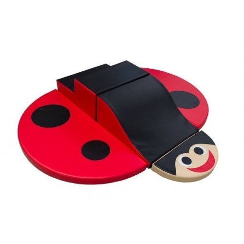 Le tapis de motricité est décoré avec 4 INSECTES cousus : le PAPILLON sur fond vert, la LIBELLULE sur fond bleu, la COCCINELLE sur fond jaune et l'ABEILLE sur fond rose.