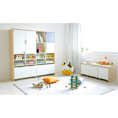 Le meuble pour salle de classe et espace périscolaire est coloré avec une finition érable et est composé de :