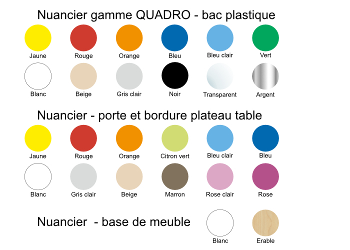 Pour PERSONNALISER les couleurs des portes et/ou des bacs de rangement du meuble pour collectivité, découvrez le nuancier ci-joint.