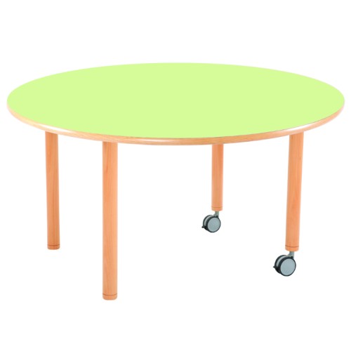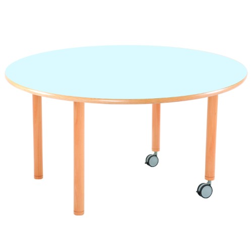 La table ronde crèche avec roulettes est disponible en 5 couleurs et 2 hauteurs de plateau.