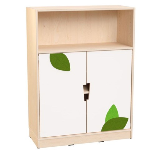 Armoire de 121.8 cm de haut avec étagères et portes qui s’ouvrent à 180° avec une décoration en feutre en forme de feuilles pour rappeler le côté nature de la gamme ECHTHOLZ.