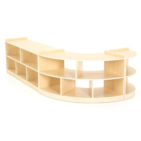Les meubles de rangement ouverts et bas sont tous disponibles individuellement : meuble Montessori bas et droit, meuble Montessori bas et incurvé et meuble Montessori d'angle.