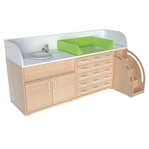 Cette table de change avec escalier et vasque est conçue pour aménager un espace de change professionnel, organisé et sécurisé.