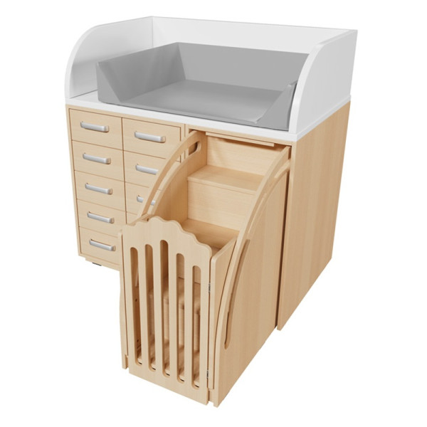 La commode avec 10 tiroirs permet de ranger efficacement vêtements, couches et accessoires, tandis que l’escalier intégré facilite l’accès au plan de change pour le personnel et les enfants. Ce mobilier allie sécurité, confort et praticité pour un usage intensif en collectivité.
