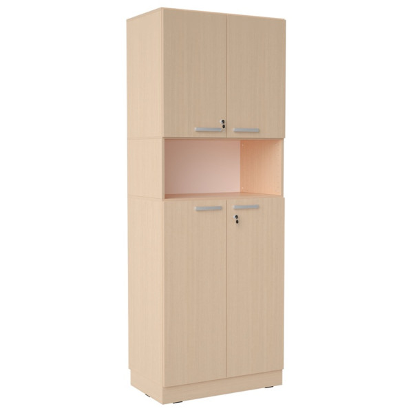 Meuble haut semi ouvert avec 7 étagères, 2 portes rouges en bas et 2 portes jaunes en haut. La hauteur de 192 cm permet d'avoir une grande capacité de rangement.